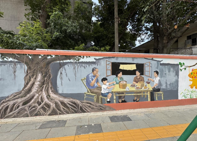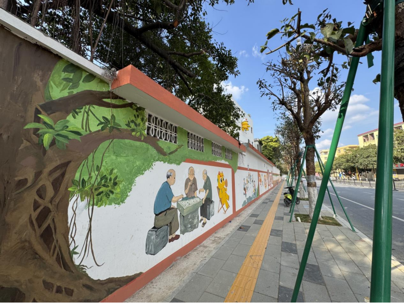 区别于简单的装饰涂绘,本次创作格外注重“在地性”与“叙事性”。师生团队在动笔前,反复观察每段围墙所处的环境。是郁郁葱葱的古榕旁,还是充满年代感的居民楼前。他们巧妙构思,让墙绘与真实场景对话,例如将真实的榕树“延伸”为画中人物闲坐聊天的背景,虚实结合,妙趣横生。